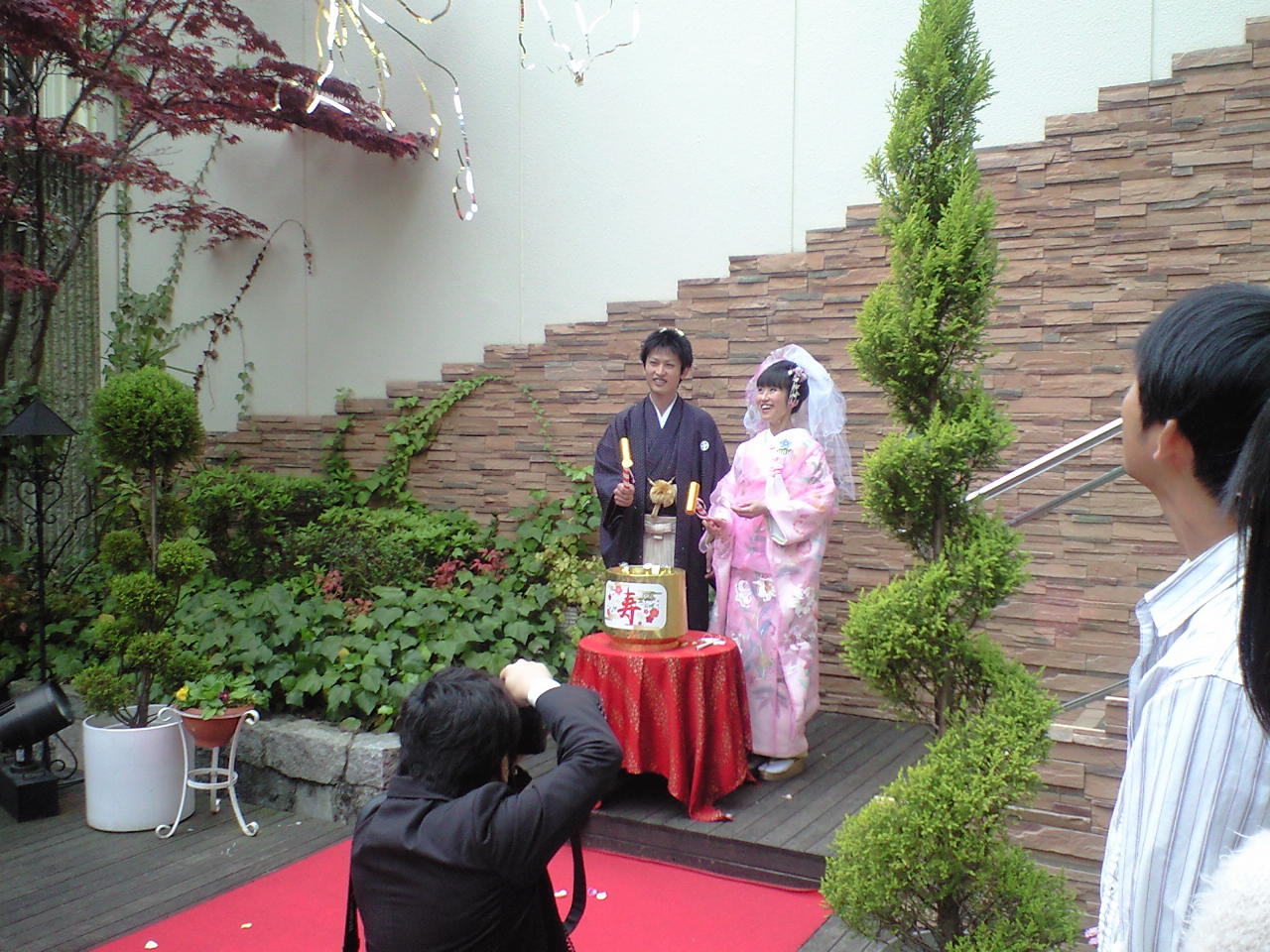 寿の樽を二人で叩くと中から、キラキラとたくさんのテープ。